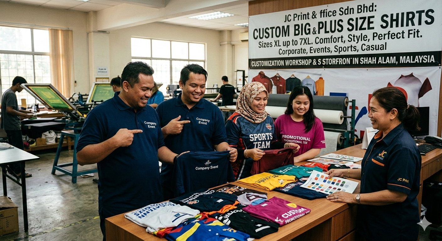 JC Print & Office Sdn Bhd, based in Klang, Selangor, is one of the leading providers of plus size and big size custom shirt printing in Malaysia. With years of experience in printing customization, the company serves customers throughout Malaysia and Singapore, including Sabah and Sarawak.